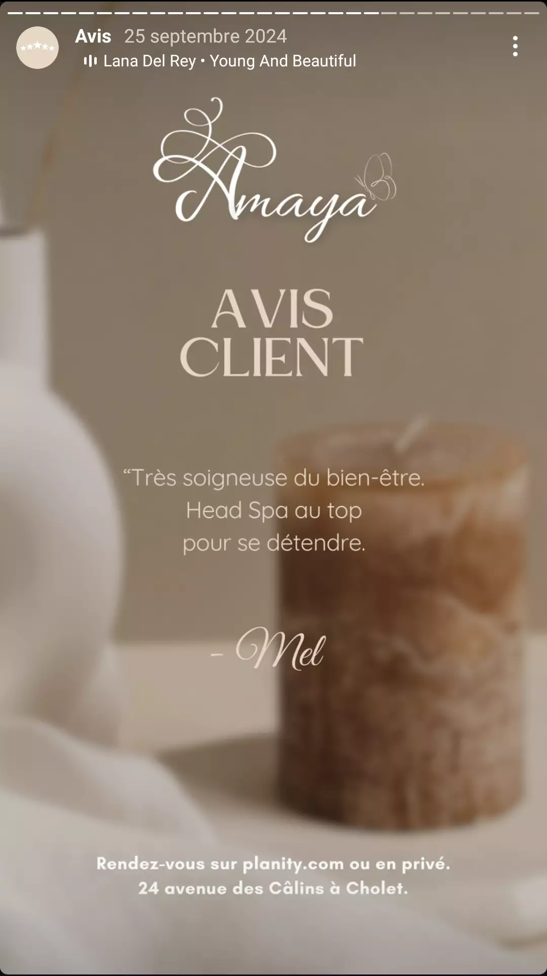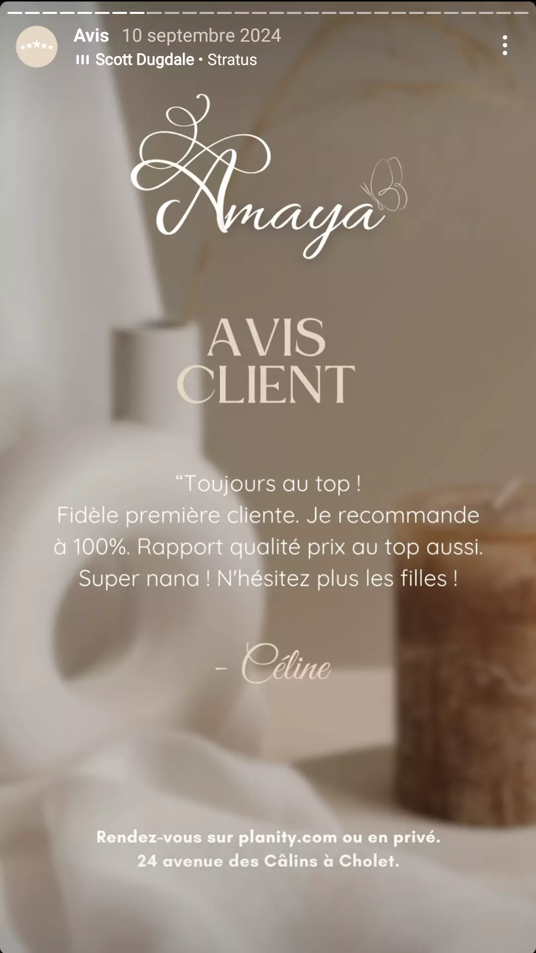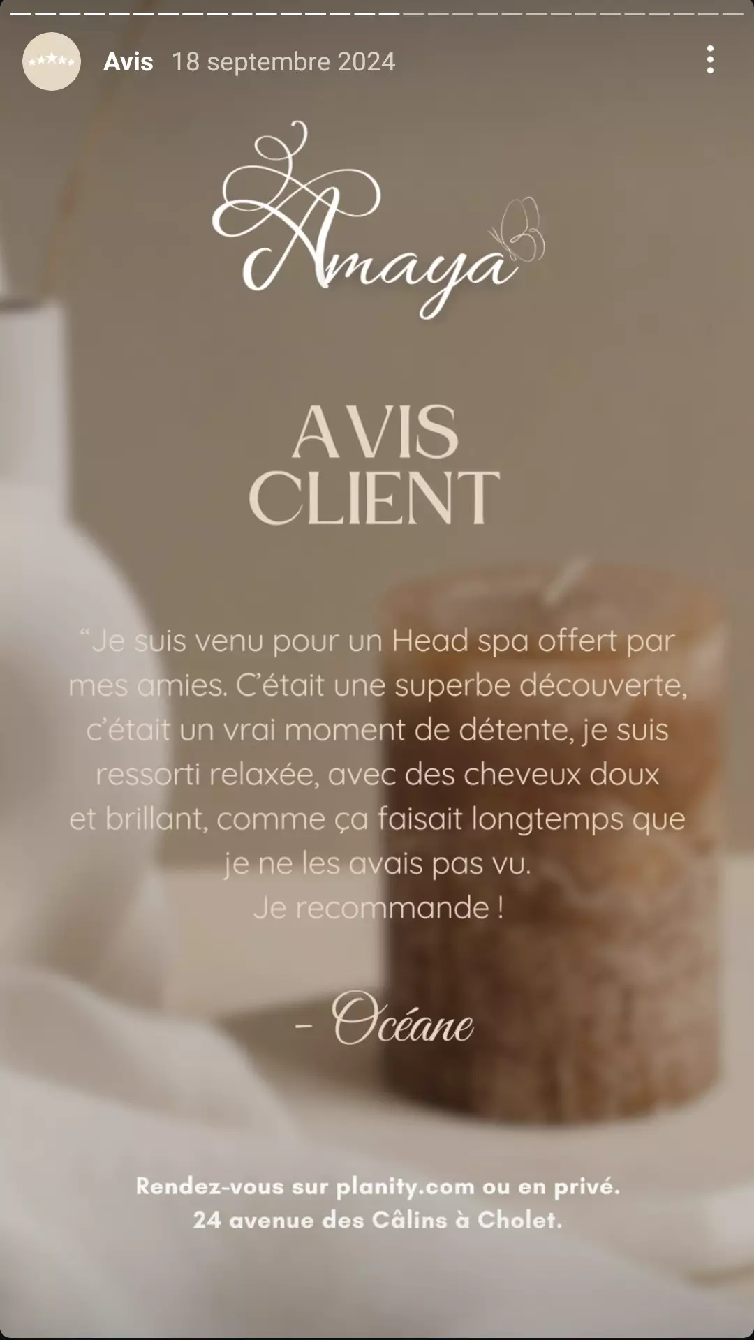 Nous tenons également à remercier celles et ceux qui prennent le temps de partager leur expérience. Votre satisfaction est notre priorité, et savoir que vous quittez Amaya Head Spa et Prothésie Ongulaire avec le sourire et un sentiment de bien-être est notre plus belle réussite.